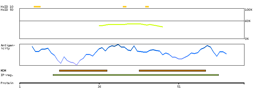 The curve in blue displays the predicted antigenicity i.e. the tendency for different regions of the protein to generate an immune response, with peak regions being predicted to be more antigenic.The curve shows average values based on a sliding window approach using an in-house propensity scale. (read more).