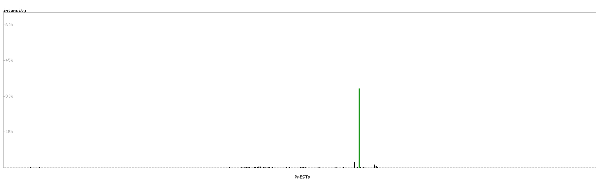 At the top of the view, the position of the antigen (identified by the corresponding HPA identifier) is shown as a green bar. A yellow triangle on the bar indicates a <100% sequence identity to the protein target.