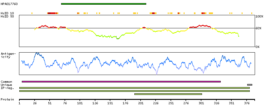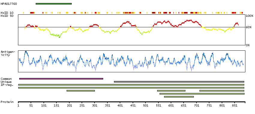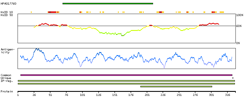 Under the antigens, the maximum percent sequence identity of the protein to all other proteins from other human genes is displayed, using a sliding window of 10 aa residues (HsID 10) or 50 aa residues (HsID 50). The region with the lowest possible identity is always selected for antigen design, with a maximum identity of 60% allowed for designing a single-target antigen (read more).