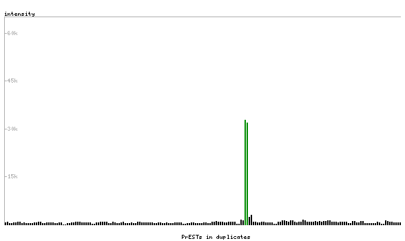 At the top of the view, the position of the antigen (identified by the corresponding HPA identifier) is shown as a green bar. A yellow triangle on the bar indicates a <100% sequence identity to the protein target.