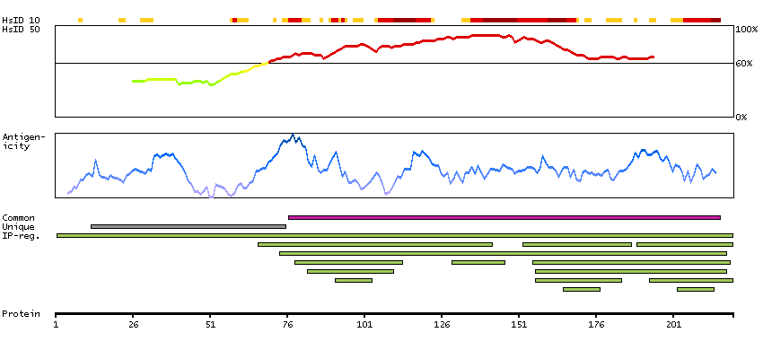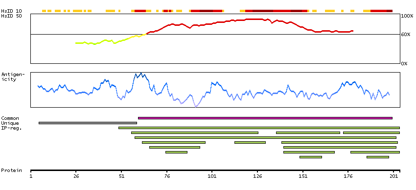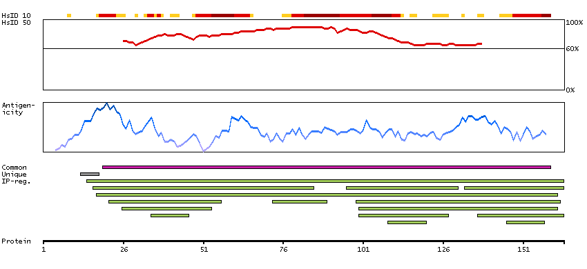 Under the antigens, the maximum percent sequence identity of the protein to all other proteins from other human genes is displayed, using a sliding window of 10 aa residues (HsID 10) or 50 aa residues (HsID 50). The region with the lowest possible identity is always selected for antigen design, with a maximum identity of 60% allowed for designing a single-target antigen (read more).