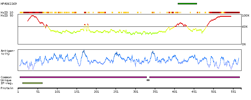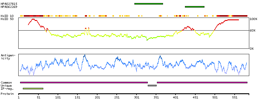 Under the antigens, the maximum percent sequence identity of the protein to all other proteins from other human genes is displayed, using a sliding window of 10 aa residues (HsID 10) or 50 aa residues (HsID 50). The region with the lowest possible identity is always selected for antigen design, with a maximum identity of 60% allowed for designing a single-target antigen (read more).