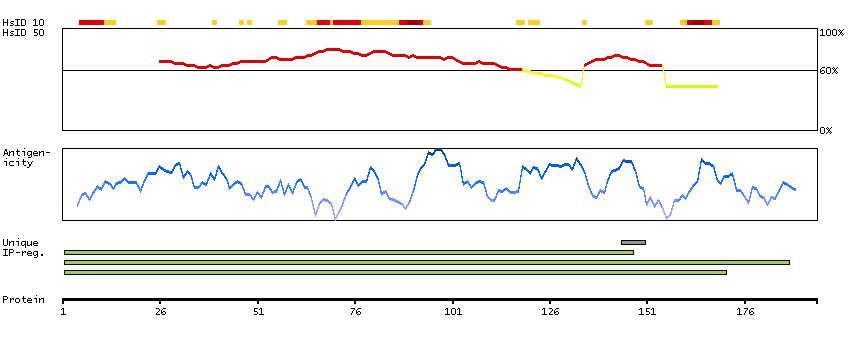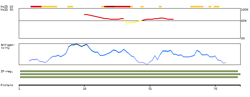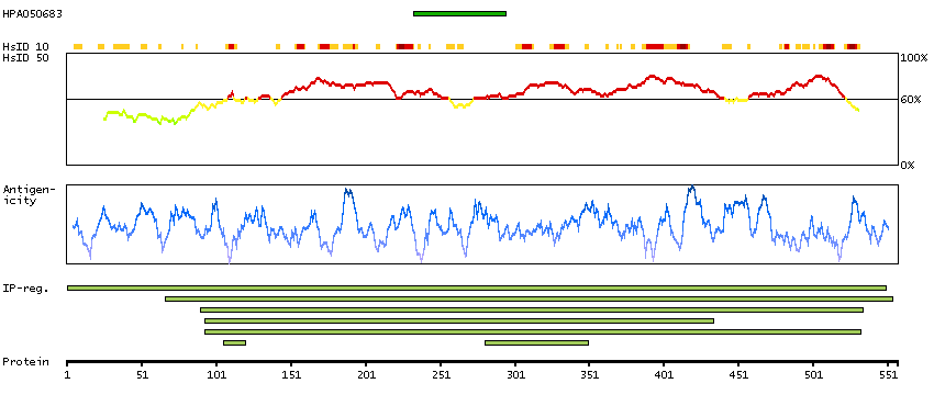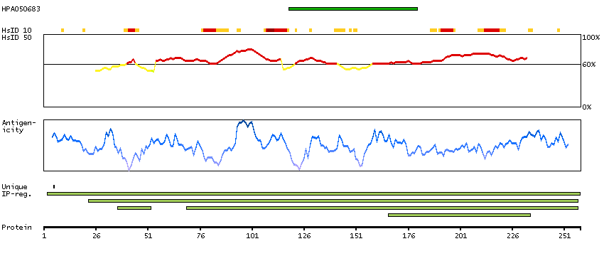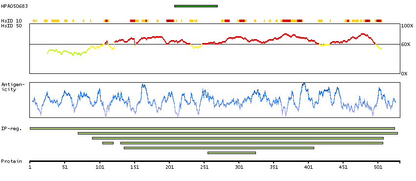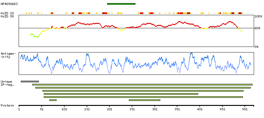 Under the antigens, the maximum percent sequence identity of the protein to all other proteins from other human genes is displayed, using a sliding window of 10 aa residues (HsID 10) or 50 aa residues (HsID 50). The region with the lowest possible identity is always selected for antigen design, with a maximum identity of 60% allowed for designing a single-target antigen (read more).