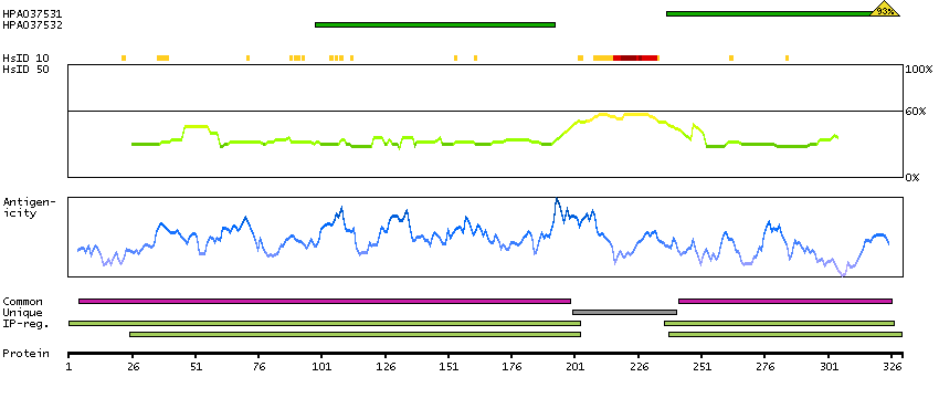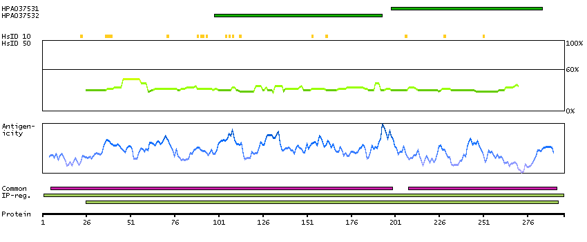 Under the antigens, the maximum percent sequence identity of the protein to all other proteins from other human genes is displayed, using a sliding window of 10 aa residues (HsID 10) or 50 aa residues (HsID 50). The region with the lowest possible identity is always selected for antigen design, with a maximum identity of 60% allowed for designing a single-target antigen (read more).