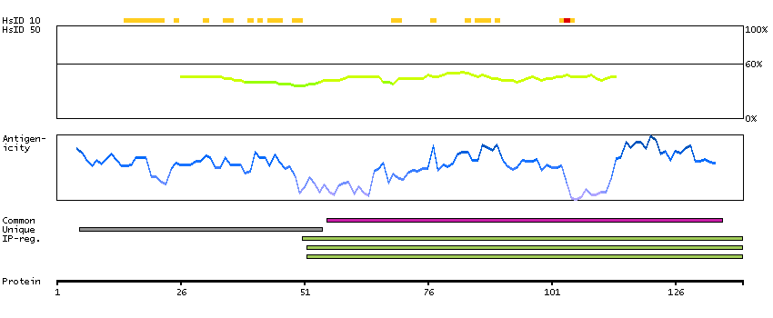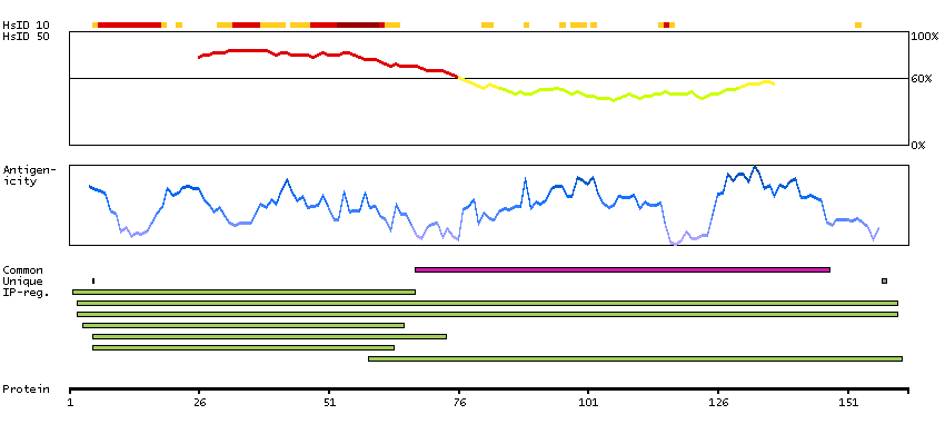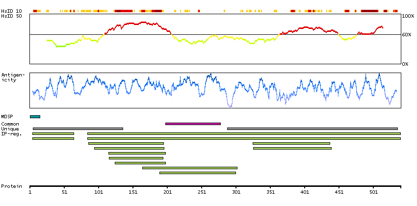 Under the antigens, the maximum percent sequence identity of the protein to all other proteins from other human genes is displayed, using a sliding window of 10 aa residues (HsID 10) or 50 aa residues (HsID 50). The region with the lowest possible identity is always selected for antigen design, with a maximum identity of 60% allowed for designing a single-target antigen (read more).