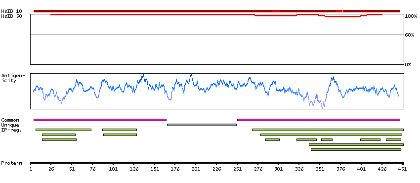 Under the antigens, the maximum percent sequence identity of the protein to all other proteins from other human genes is displayed, using a sliding window of 10 aa residues (HsID 10) or 50 aa residues (HsID 50). The region with the lowest possible identity is always selected for antigen design, with a maximum identity of 60% allowed for designing a single-target antigen (read more).