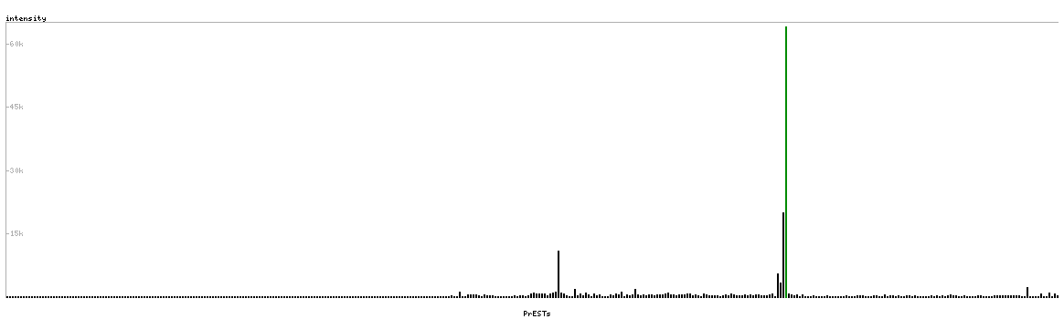 At the top of the view, the position of the antigen (identified by the corresponding HPA identifier) is shown as a green bar. A yellow triangle on the bar indicates a <100% sequence identity to the protein target.