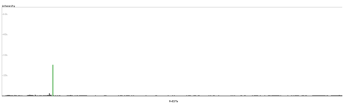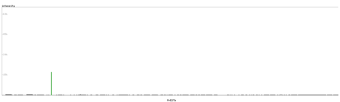 At the top of the view, the position of the antigen (identified by the corresponding HPA identifier) is shown as a green bar. A yellow triangle on the bar indicates a <100% sequence identity to the protein target.
