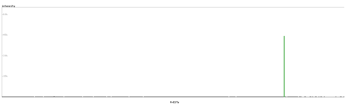 At the top of the view, the position of the antigen (identified by the corresponding HPA identifier) is shown as a green bar. A yellow triangle on the bar indicates a <100% sequence identity to the protein target.