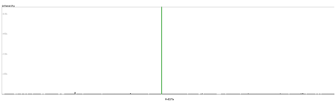 At the top of the view, the position of the antigen (identified by the corresponding HPA identifier) is shown as a green bar. A yellow triangle on the bar indicates a <100% sequence identity to the protein target.