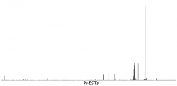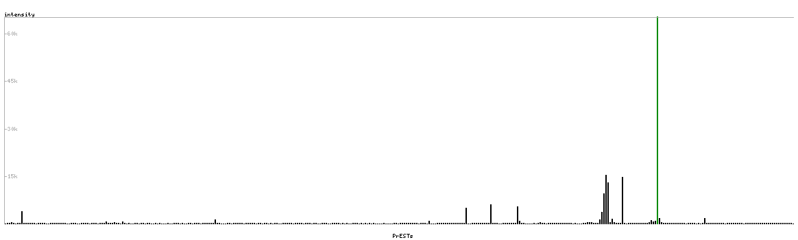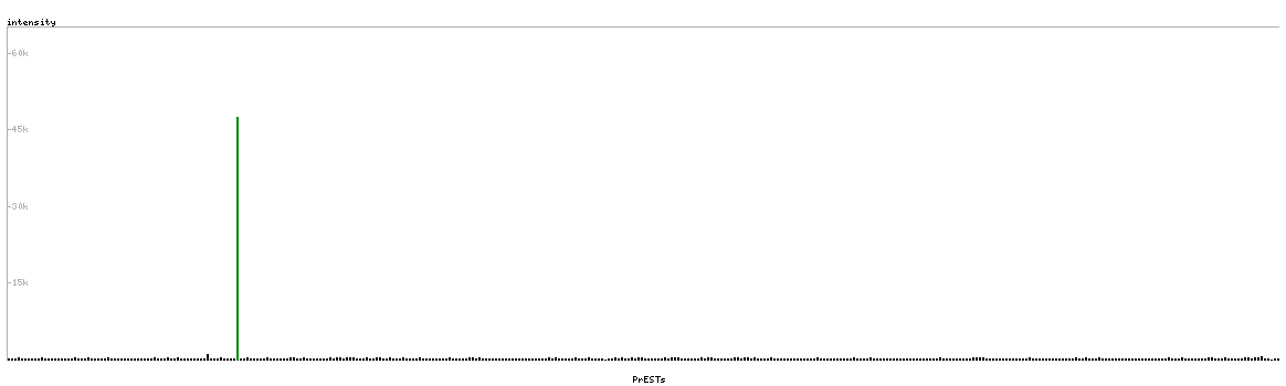 At the top of the view, the position of the antigen (identified by the corresponding HPA identifier) is shown as a green bar. A yellow triangle on the bar indicates a <100% sequence identity to the protein target.