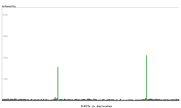 At the top of the view, the position of the antigen (identified by the corresponding HPA identifier) is shown as a green bar. A yellow triangle on the bar indicates a <100% sequence identity to the protein target.