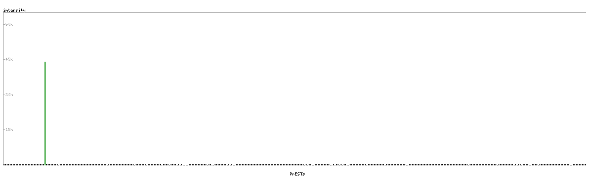 At the top of the view, the position of the antigen (identified by the corresponding HPA identifier) is shown as a green bar. A yellow triangle on the bar indicates a <100% sequence identity to the protein target.