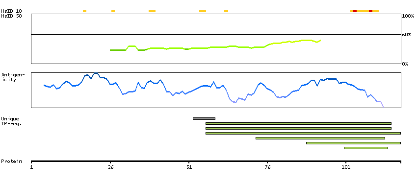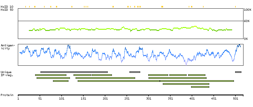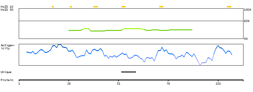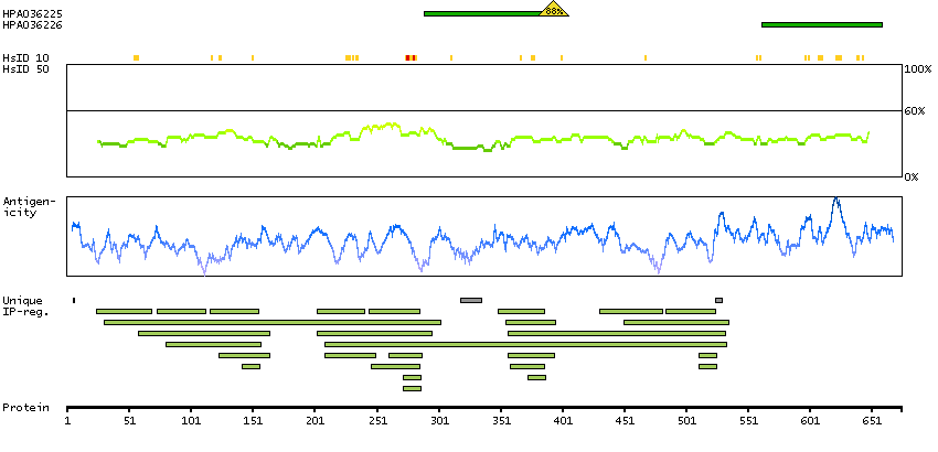 Under the antigens, the maximum percent sequence identity of the protein to all other proteins from other human genes is displayed, using a sliding window of 10 aa residues (HsID 10) or 50 aa residues (HsID 50). The region with the lowest possible identity is always selected for antigen design, with a maximum identity of 60% allowed for designing a single-target antigen (read more).