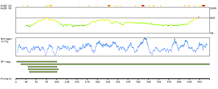 Under the antigens, the maximum percent sequence identity of the protein to all other proteins from other human genes is displayed, using a sliding window of 10 aa residues (HsID 10) or 50 aa residues (HsID 50). The region with the lowest possible identity is always selected for antigen design, with a maximum identity of 60% allowed for designing a single-target antigen (read more).