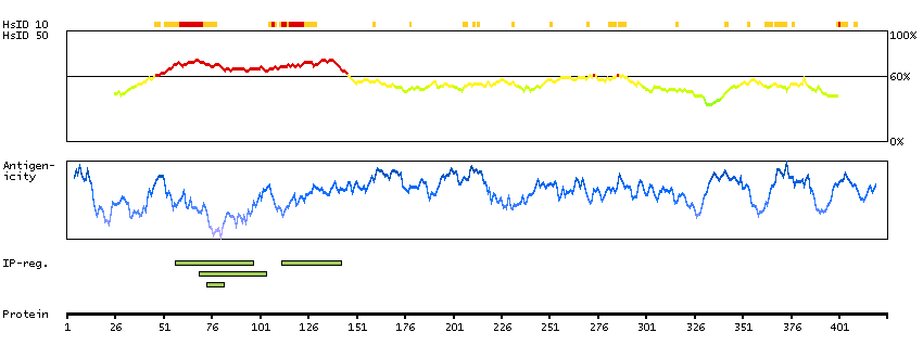 Under the antigens, the maximum percent sequence identity of the protein to all other proteins from other human genes is displayed, using a sliding window of 10 aa residues (HsID 10) or 50 aa residues (HsID 50). The region with the lowest possible identity is always selected for antigen design, with a maximum identity of 60% allowed for designing a single-target antigen (read more).