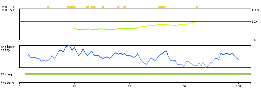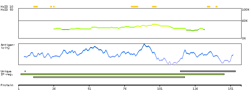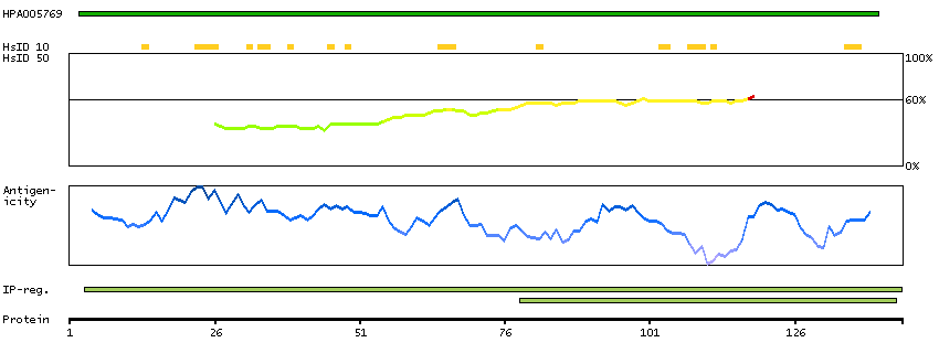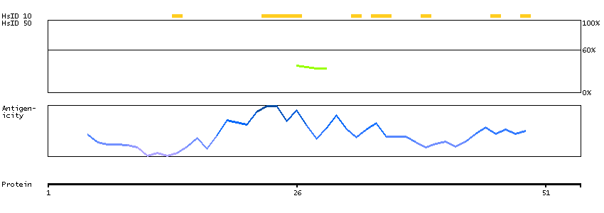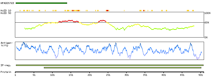 Under the antigens, the maximum percent sequence identity of the protein to all other proteins from other human genes is displayed, using a sliding window of 10 aa residues (HsID 10) or 50 aa residues (HsID 50). The region with the lowest possible identity is always selected for antigen design, with a maximum identity of 60% allowed for designing a single-target antigen (read more).