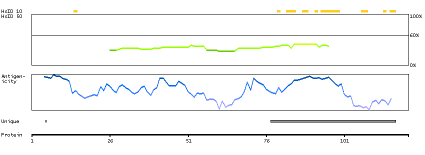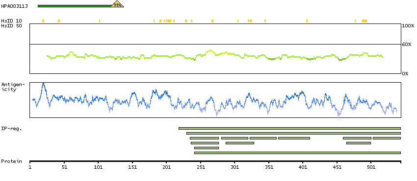 Under the antigens, the maximum percent sequence identity of the protein to all other proteins from other human genes is displayed, using a sliding window of 10 aa residues (HsID 10) or 50 aa residues (HsID 50). The region with the lowest possible identity is always selected for antigen design, with a maximum identity of 60% allowed for designing a single-target antigen (read more).