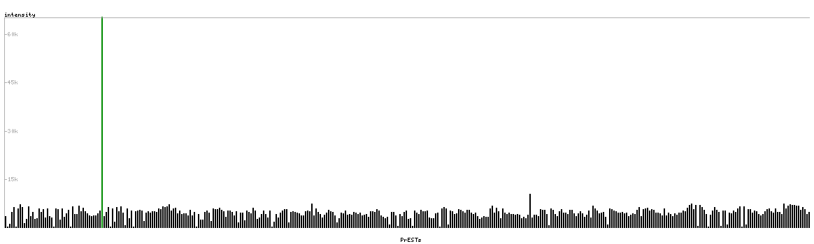 At the top of the view, the position of the antigen (identified by the corresponding HPA identifier) is shown as a green bar. A yellow triangle on the bar indicates a <100% sequence identity to the protein target.