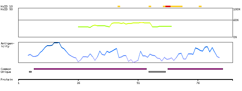 Under the antigens, the maximum percent sequence identity of the protein to all other proteins from other human genes is displayed, using a sliding window of 10 aa residues (HsID 10) or 50 aa residues (HsID 50). The region with the lowest possible identity is always selected for antigen design, with a maximum identity of 60% allowed for designing a single-target antigen (read more).