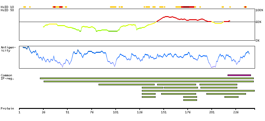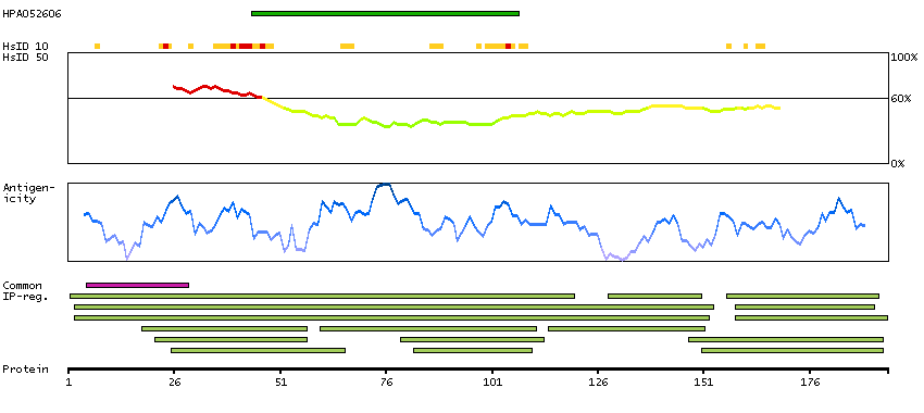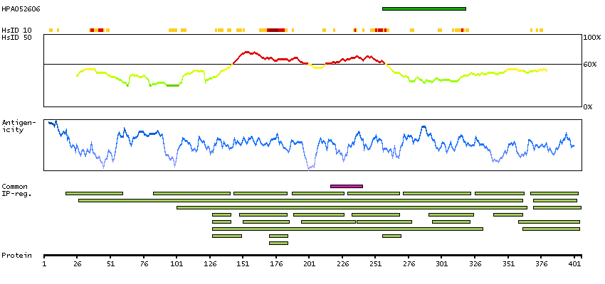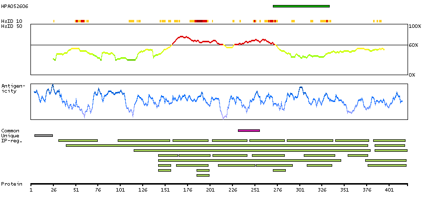 Under the antigens, the maximum percent sequence identity of the protein to all other proteins from other human genes is displayed, using a sliding window of 10 aa residues (HsID 10) or 50 aa residues (HsID 50). The region with the lowest possible identity is always selected for antigen design, with a maximum identity of 60% allowed for designing a single-target antigen (read more).