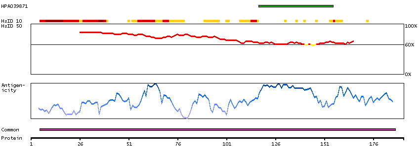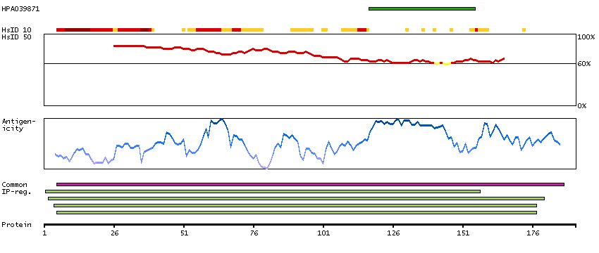 Under the antigens, the maximum percent sequence identity of the protein to all other proteins from other human genes is displayed, using a sliding window of 10 aa residues (HsID 10) or 50 aa residues (HsID 50). The region with the lowest possible identity is always selected for antigen design, with a maximum identity of 60% allowed for designing a single-target antigen (read more).