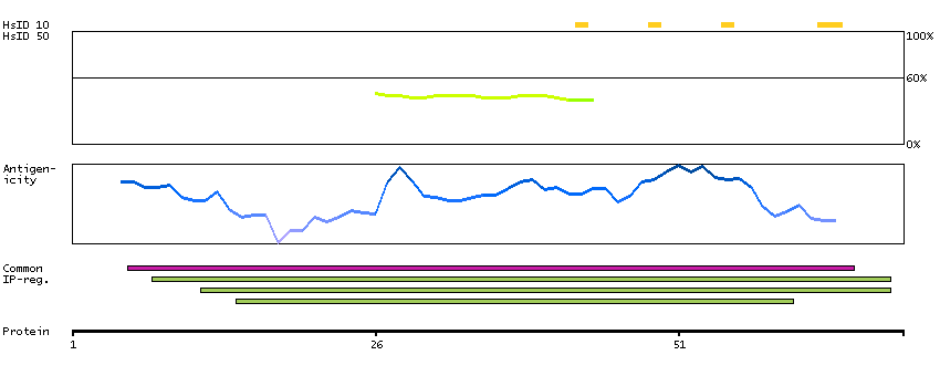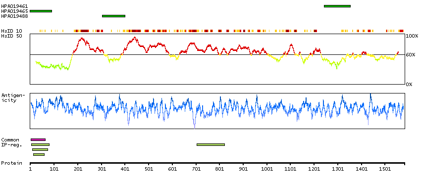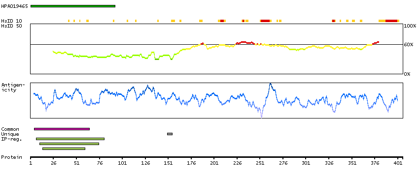 Under the antigens, the maximum percent sequence identity of the protein to all other proteins from other human genes is displayed, using a sliding window of 10 aa residues (HsID 10) or 50 aa residues (HsID 50). The region with the lowest possible identity is always selected for antigen design, with a maximum identity of 60% allowed for designing a single-target antigen (read more).