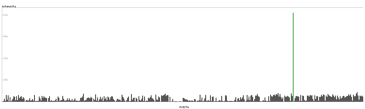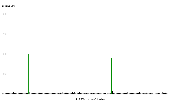 At the top of the view, the position of the antigen (identified by the corresponding HPA identifier) is shown as a green bar. A yellow triangle on the bar indicates a <100% sequence identity to the protein target.