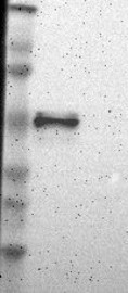 Band of predicted size in kDa (+/-20%) with additional bands present. Analysis performed using a standard panel of samples.