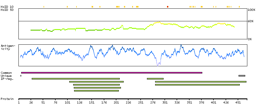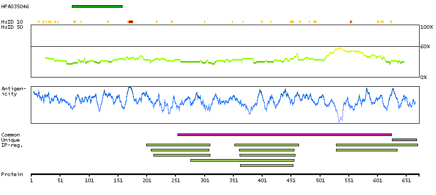 Under the antigens, the maximum percent sequence identity of the protein to all other proteins from other human genes is displayed, using a sliding window of 10 aa residues (HsID 10) or 50 aa residues (HsID 50). The region with the lowest possible identity is always selected for antigen design, with a maximum identity of 60% allowed for designing a single-target antigen (read more).
