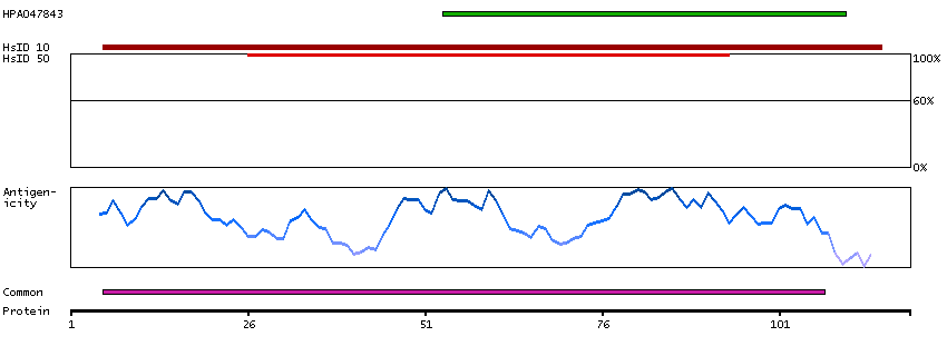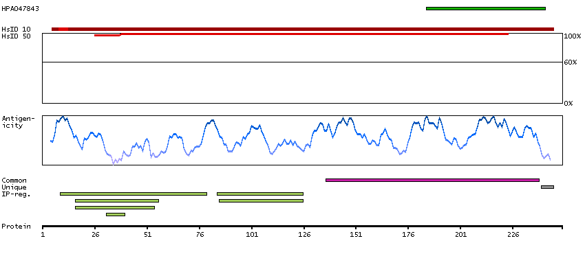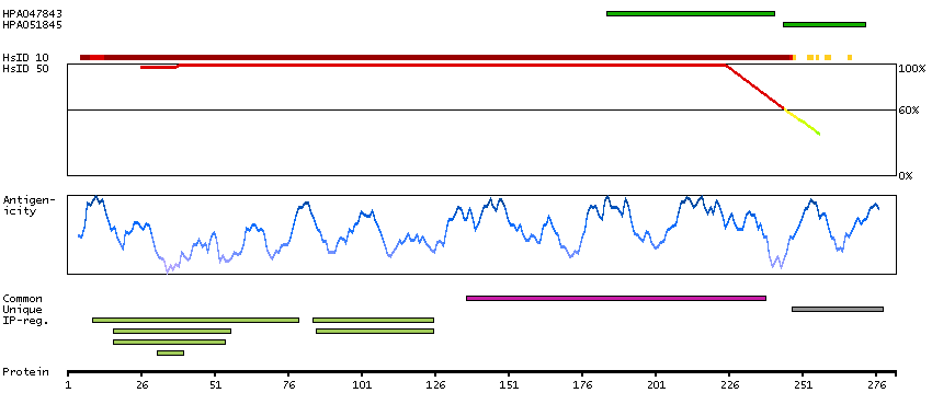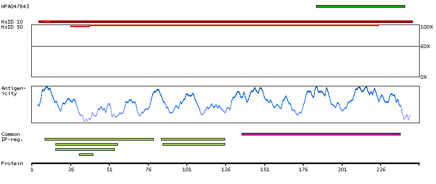 Under the antigens, the maximum percent sequence identity of the protein to all other proteins from other human genes is displayed, using a sliding window of 10 aa residues (HsID 10) or 50 aa residues (HsID 50). The region with the lowest possible identity is always selected for antigen design, with a maximum identity of 60% allowed for designing a single-target antigen (read more).
