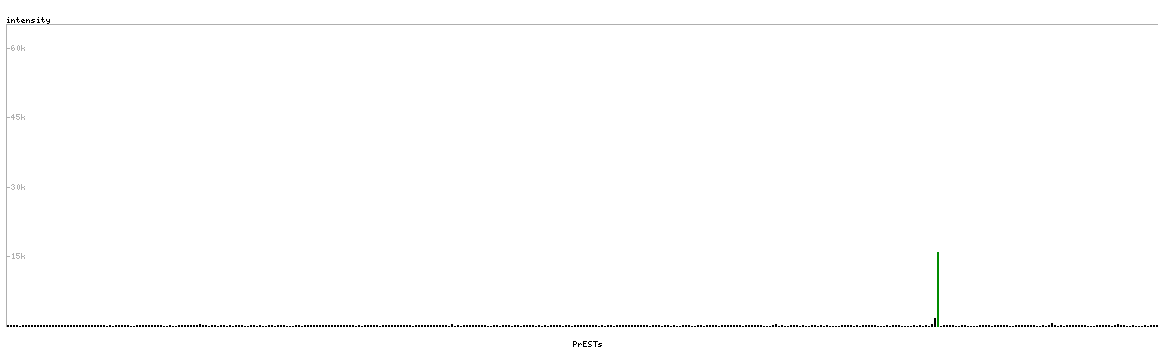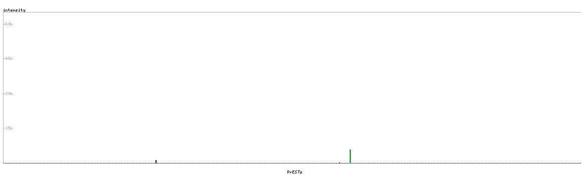 At the top of the view, the position of the antigen (identified by the corresponding HPA identifier) is shown as a green bar. A yellow triangle on the bar indicates a <100% sequence identity to the protein target.