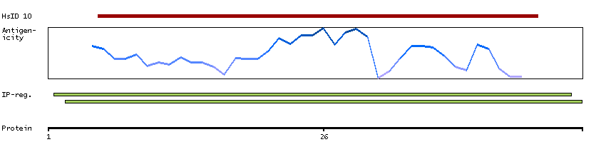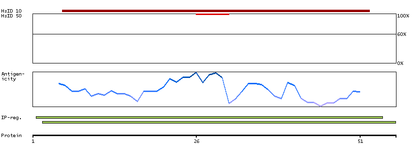 Under the antigens, the maximum percent sequence identity of the protein to all other proteins from other human genes is displayed, using a sliding window of 10 aa residues (HsID 10) or 50 aa residues (HsID 50). The region with the lowest possible identity is always selected for antigen design, with a maximum identity of 60% allowed for designing a single-target antigen (read more).