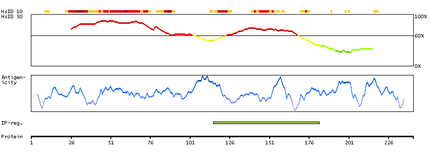 Under the antigens, the maximum percent sequence identity of the protein to all other proteins from other human genes is displayed, using a sliding window of 10 aa residues (HsID 10) or 50 aa residues (HsID 50). The region with the lowest possible identity is always selected for antigen design, with a maximum identity of 60% allowed for designing a single-target antigen (read more).