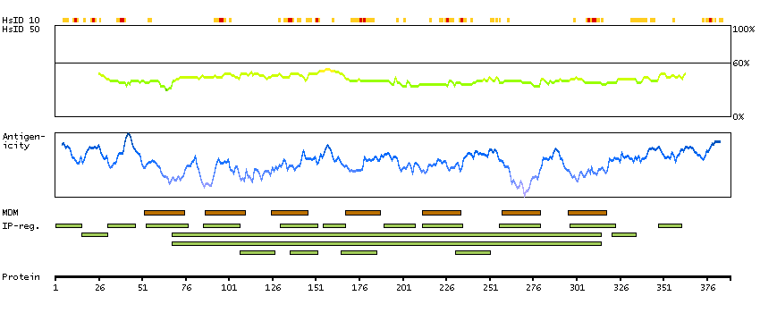 The curve in blue displays the predicted antigenicity i.e. the tendency for different regions of the protein to generate an immune response, with peak regions being predicted to be more antigenic.The curve shows average values based on a sliding window approach using an in-house propensity scale. (read more).