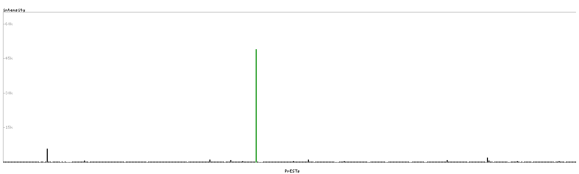 At the top of the view, the position of the antigen (identified by the corresponding HPA identifier) is shown as a green bar. A yellow triangle on the bar indicates a <100% sequence identity to the protein target.