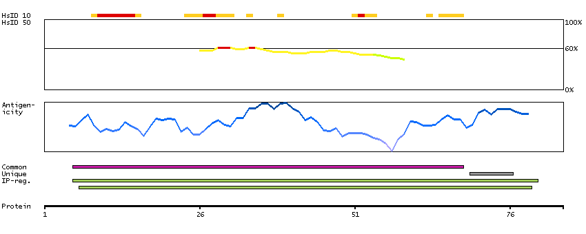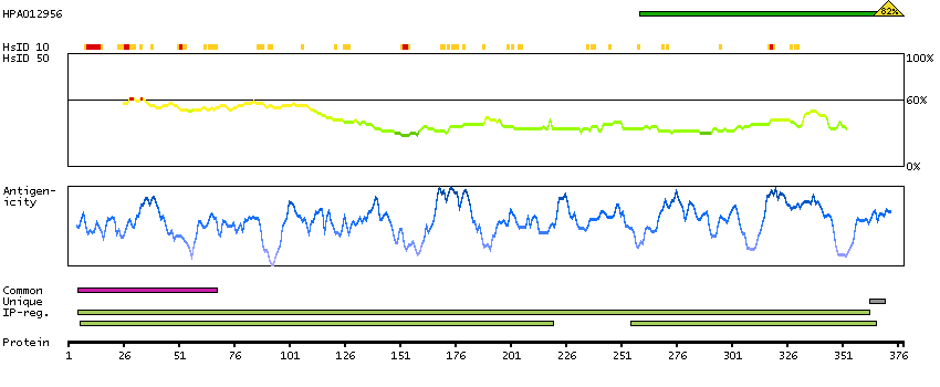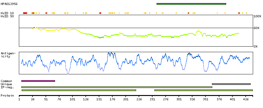 Under the antigens, the maximum percent sequence identity of the protein to all other proteins from other human genes is displayed, using a sliding window of 10 aa residues (HsID 10) or 50 aa residues (HsID 50). The region with the lowest possible identity is always selected for antigen design, with a maximum identity of 60% allowed for designing a single-target antigen (read more).