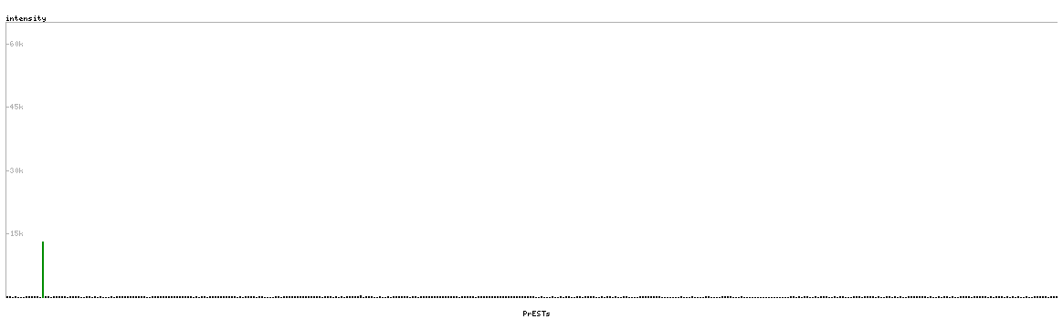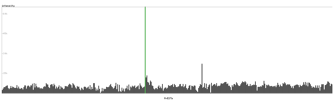 At the top of the view, the position of the antigen (identified by the corresponding HPA identifier) is shown as a green bar. A yellow triangle on the bar indicates a <100% sequence identity to the protein target.