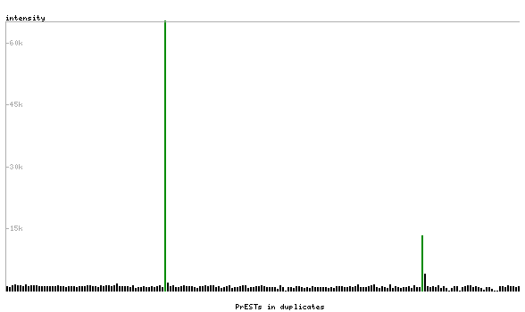 At the top of the view, the position of the antigen (identified by the corresponding HPA identifier) is shown as a green bar. A yellow triangle on the bar indicates a <100% sequence identity to the protein target.