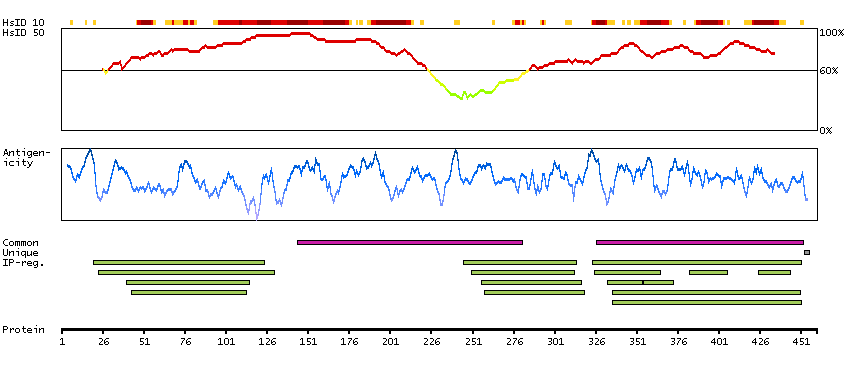 Under the antigens, the maximum percent sequence identity of the protein to all other proteins from other human genes is displayed, using a sliding window of 10 aa residues (HsID 10) or 50 aa residues (HsID 50). The region with the lowest possible identity is always selected for antigen design, with a maximum identity of 60% allowed for designing a single-target antigen (read more).