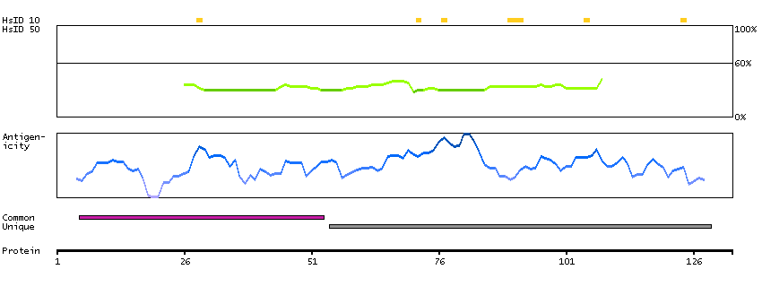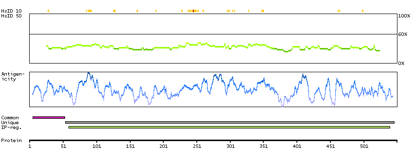 Under the antigens, the maximum percent sequence identity of the protein to all other proteins from other human genes is displayed, using a sliding window of 10 aa residues (HsID 10) or 50 aa residues (HsID 50). The region with the lowest possible identity is always selected for antigen design, with a maximum identity of 60% allowed for designing a single-target antigen (read more).