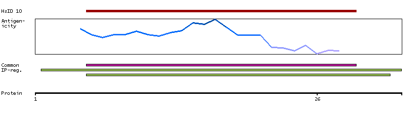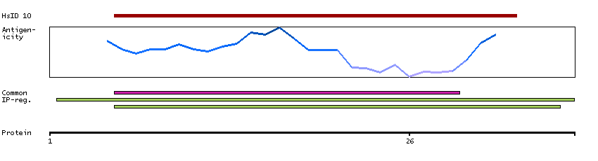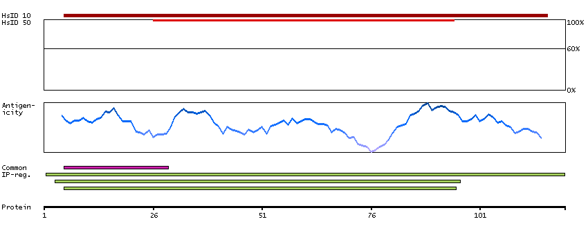Under the antigens, the maximum percent sequence identity of the protein to all other proteins from other human genes is displayed, using a sliding window of 10 aa residues (HsID 10) or 50 aa residues (HsID 50). The region with the lowest possible identity is always selected for antigen design, with a maximum identity of 60% allowed for designing a single-target antigen (read more).
