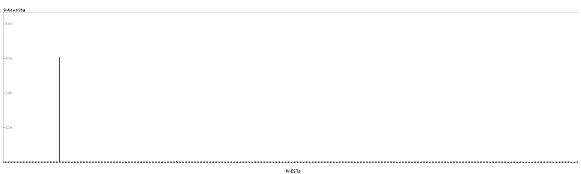 At the top of the view, the position of the antigen (identified by the corresponding HPA identifier) is shown as a green bar. A yellow triangle on the bar indicates a <100% sequence identity to the protein target.