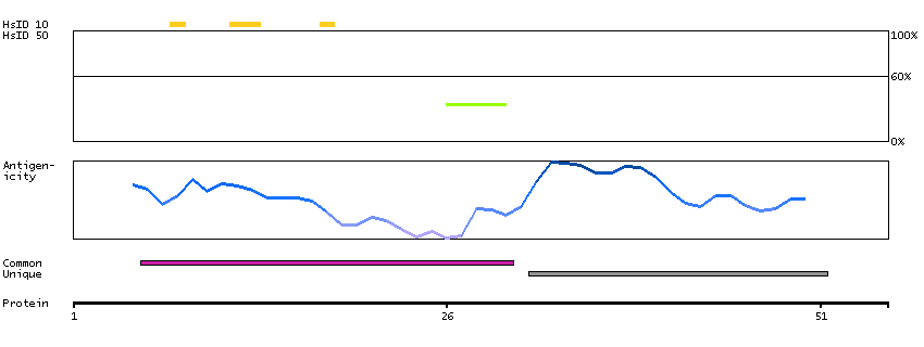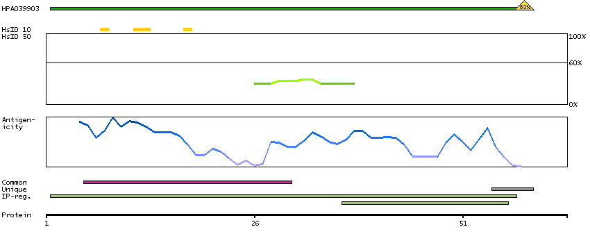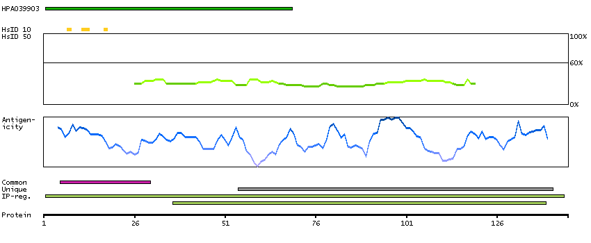 Under the antigens, the maximum percent sequence identity of the protein to all other proteins from other human genes is displayed, using a sliding window of 10 aa residues (HsID 10) or 50 aa residues (HsID 50). The region with the lowest possible identity is always selected for antigen design, with a maximum identity of 60% allowed for designing a single-target antigen (read more).