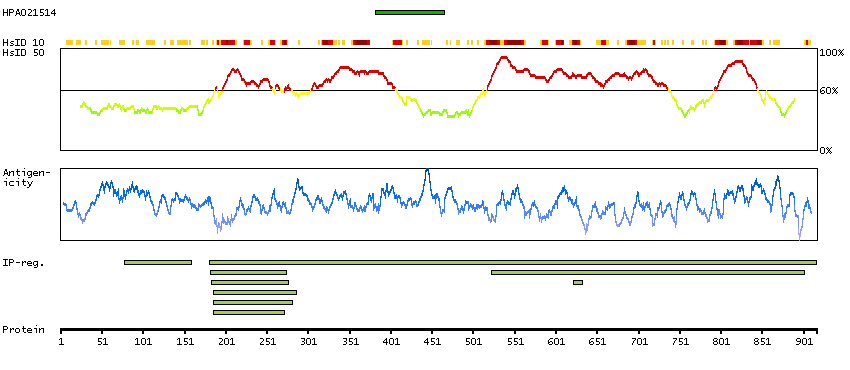 The curve in blue displays the predicted antigenicity i.e. the tendency for different regions of the protein to generate an immune response, with peak regions being predicted to be more antigenic.The curve shows average values based on a sliding window approach using an in-house propensity scale. (read more).