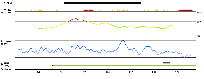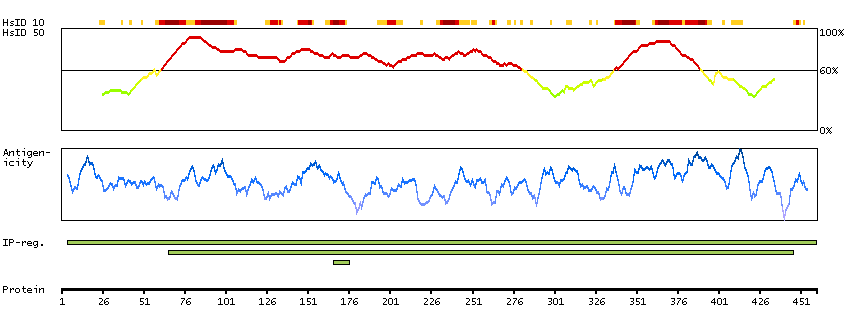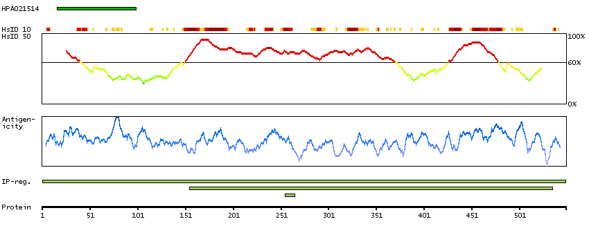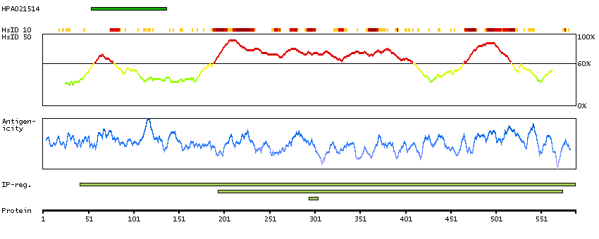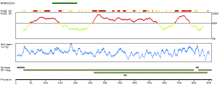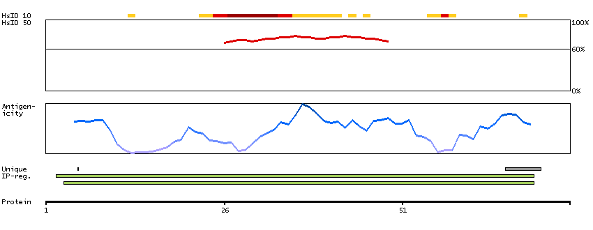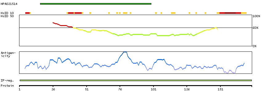 Under the antigens, the maximum percent sequence identity of the protein to all other proteins from other human genes is displayed, using a sliding window of 10 aa residues (HsID 10) or 50 aa residues (HsID 50). The region with the lowest possible identity is always selected for antigen design, with a maximum identity of 60% allowed for designing a single-target antigen (read more).