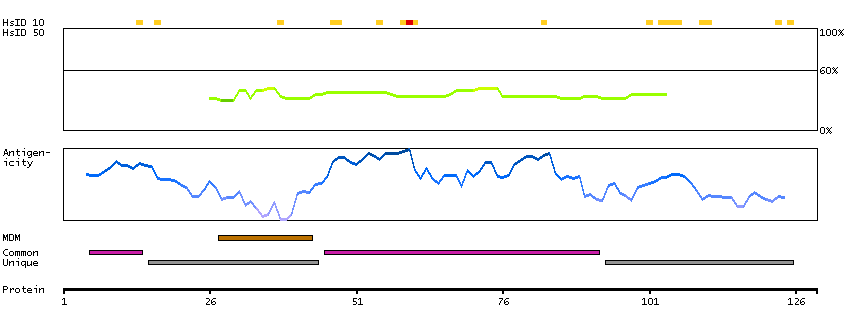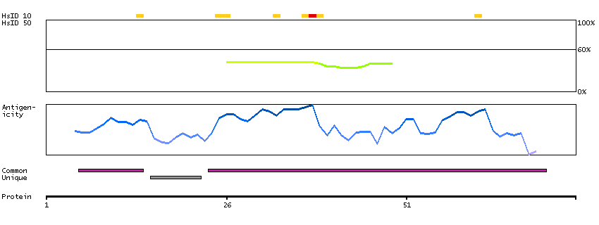 Under the antigens, the maximum percent sequence identity of the protein to all other proteins from other human genes is displayed, using a sliding window of 10 aa residues (HsID 10) or 50 aa residues (HsID 50). The region with the lowest possible identity is always selected for antigen design, with a maximum identity of 60% allowed for designing a single-target antigen (read more).