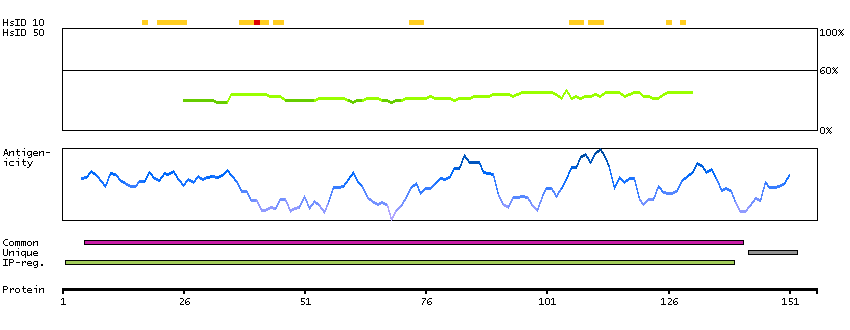 Under the antigens, the maximum percent sequence identity of the protein to all other proteins from other human genes is displayed, using a sliding window of 10 aa residues (HsID 10) or 50 aa residues (HsID 50). The region with the lowest possible identity is always selected for antigen design, with a maximum identity of 60% allowed for designing a single-target antigen (read more).