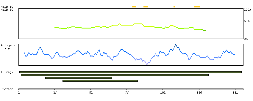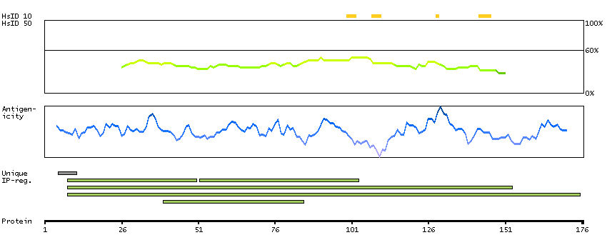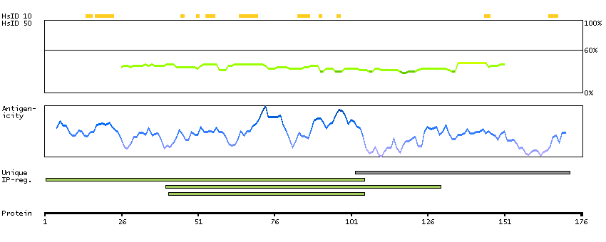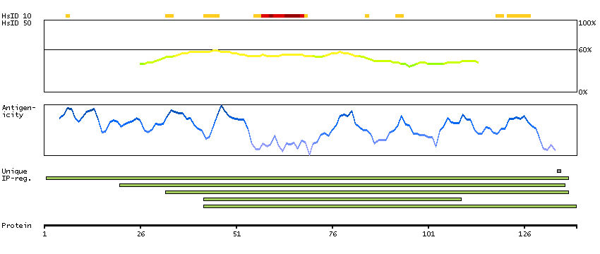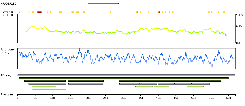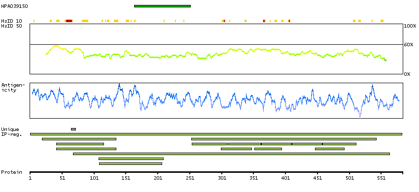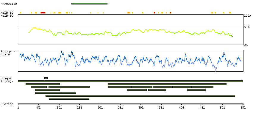 Under the antigens, the maximum percent sequence identity of the protein to all other proteins from other human genes is displayed, using a sliding window of 10 aa residues (HsID 10) or 50 aa residues (HsID 50). The region with the lowest possible identity is always selected for antigen design, with a maximum identity of 60% allowed for designing a single-target antigen (read more).