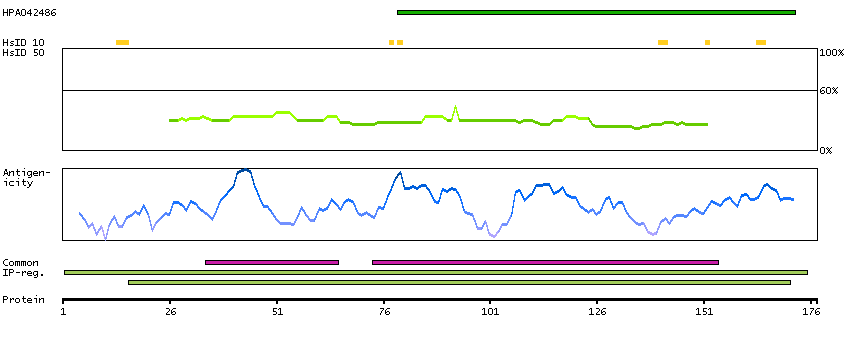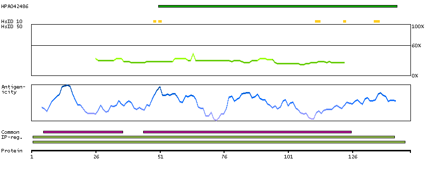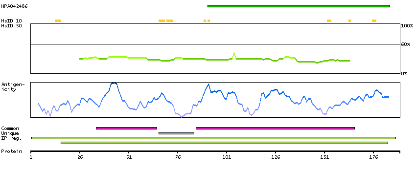 Under the antigens, the maximum percent sequence identity of the protein to all other proteins from other human genes is displayed, using a sliding window of 10 aa residues (HsID 10) or 50 aa residues (HsID 50). The region with the lowest possible identity is always selected for antigen design, with a maximum identity of 60% allowed for designing a single-target antigen (read more).